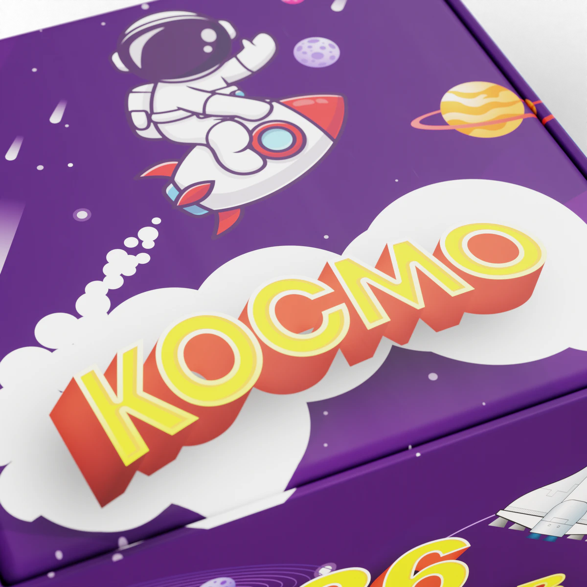 Космическая эстетика — упаковка с фиолетовым фоном, весёлыми планетами и отважным космонавтом создаёт настроение приключений.