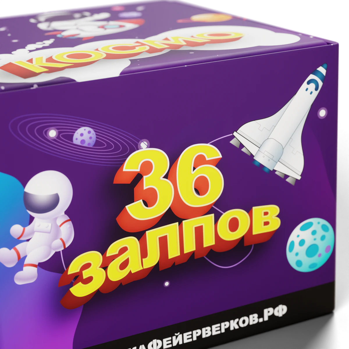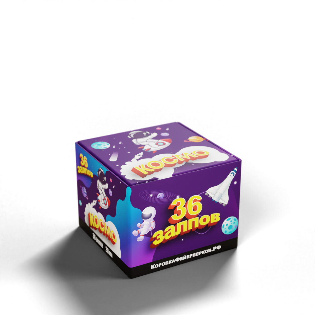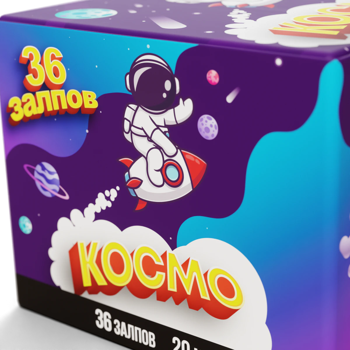 Отправляйтесь в космическое приключение с фейерверком «КОСМО»! 36 залпов калибра 20 мм, упакованных в загадочный фиолетовый космос с весёлыми планетами и отважным космонавтом, подарят вам незабываемое путешествие по просторам вселенной. Яркие краски, таинственное мерцание и мощный финал — как миссия к далёким галактикам!