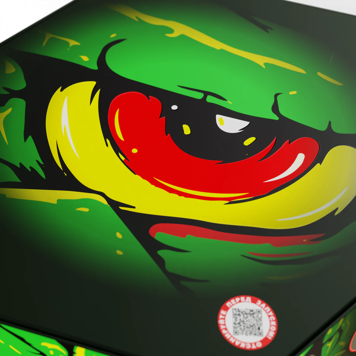Упаковка с оскалом Годзиллы — предупреждение: то, что внутри, не должно попасть в руки слабаков.